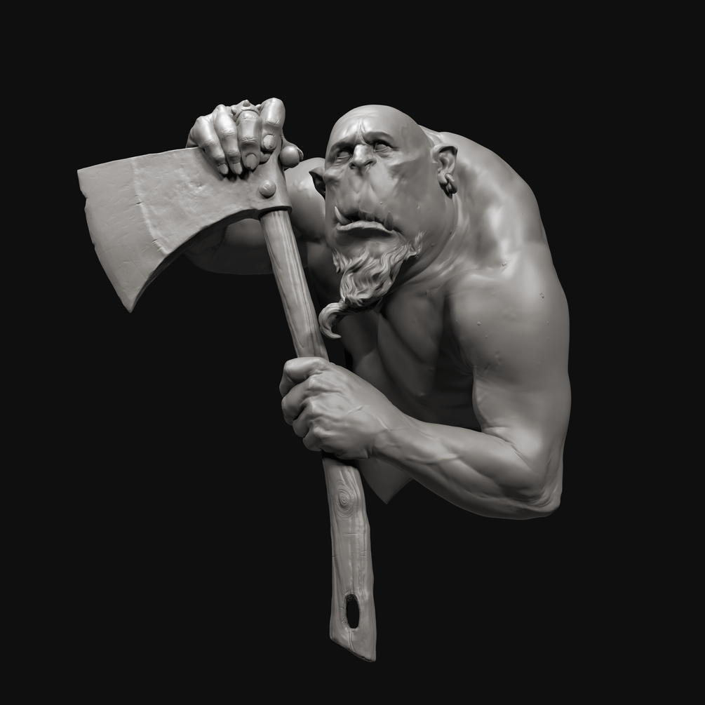 This sculpture includes STL files with and without supports, both hollow and solid. It has a total size of approximately 62mm. To facilitate painting and printing, this figure is cut into three different parts: the body, the axe, and a section of the axe handle to hide the cut inside the palm of the hand. Also, this pack includes a set of high-resolution photographs of the paint job.