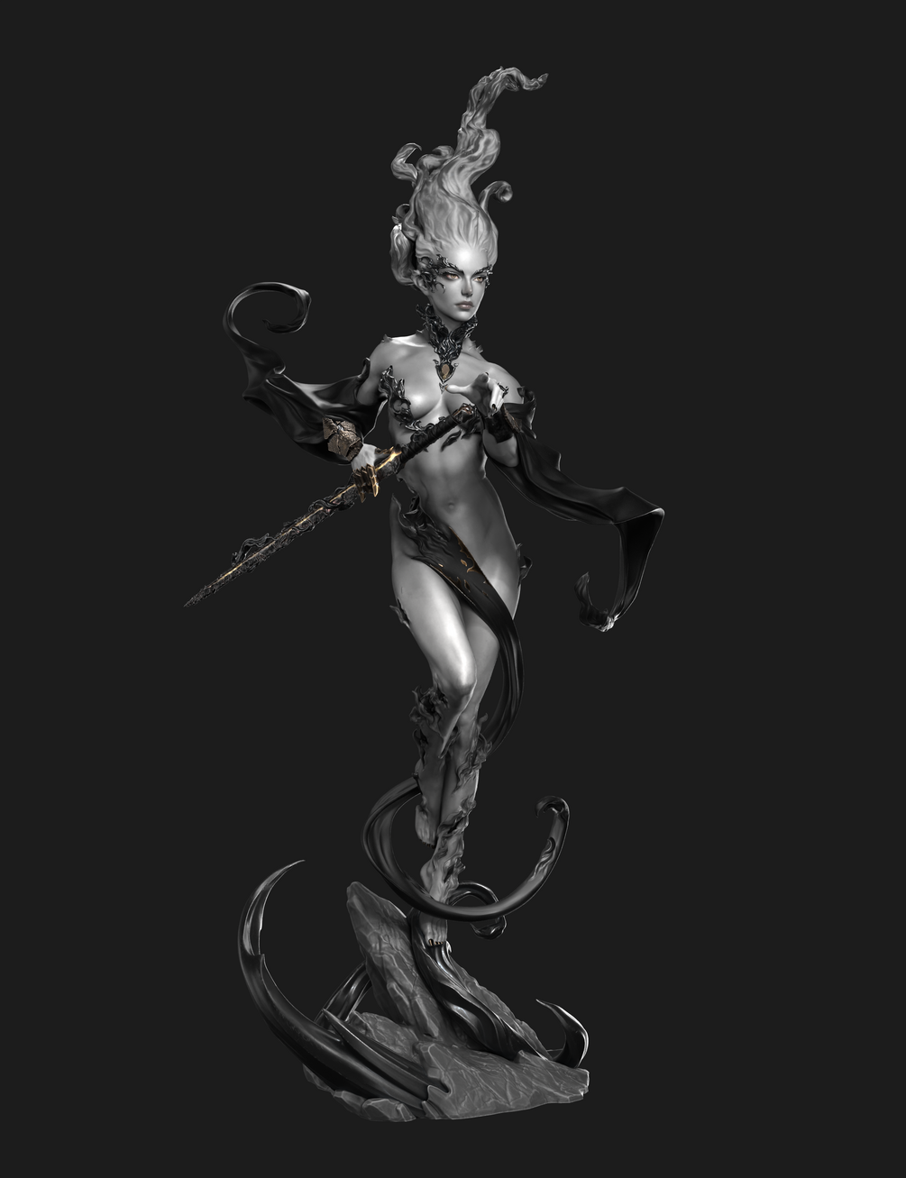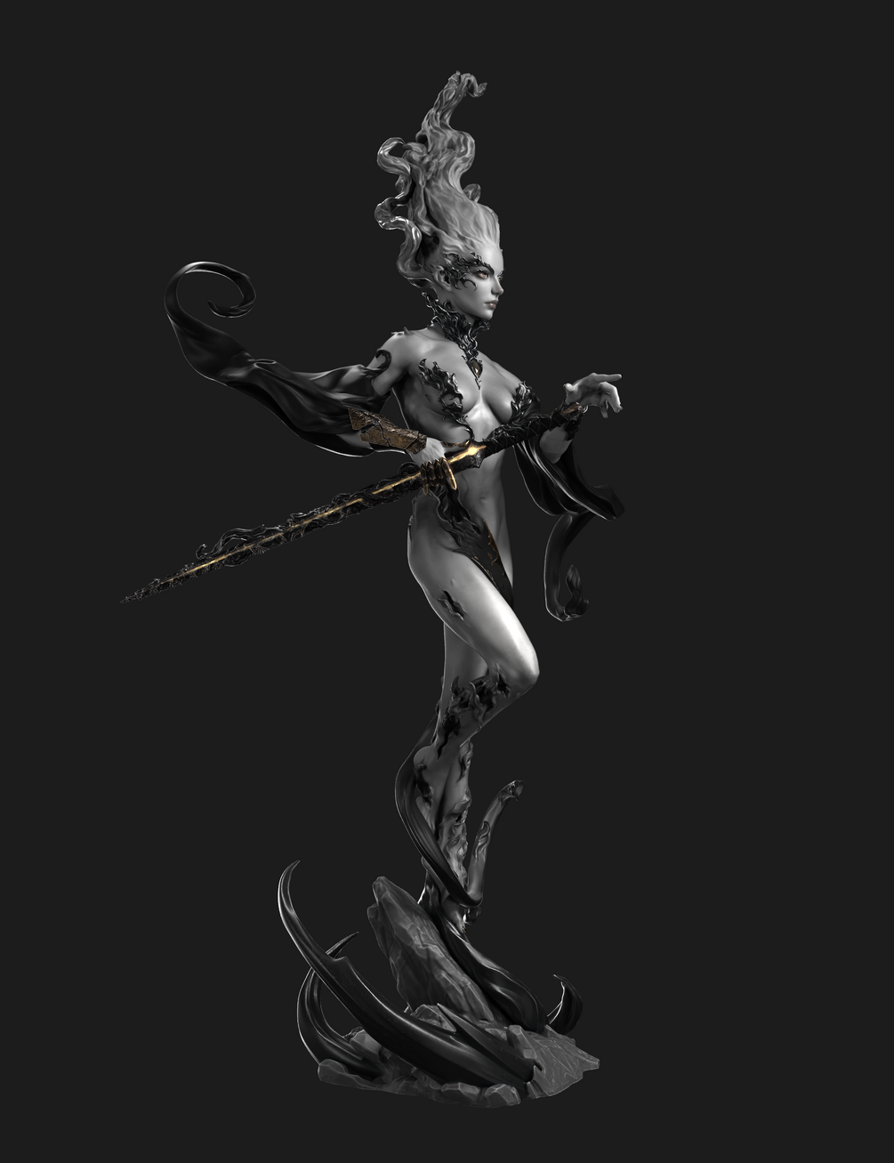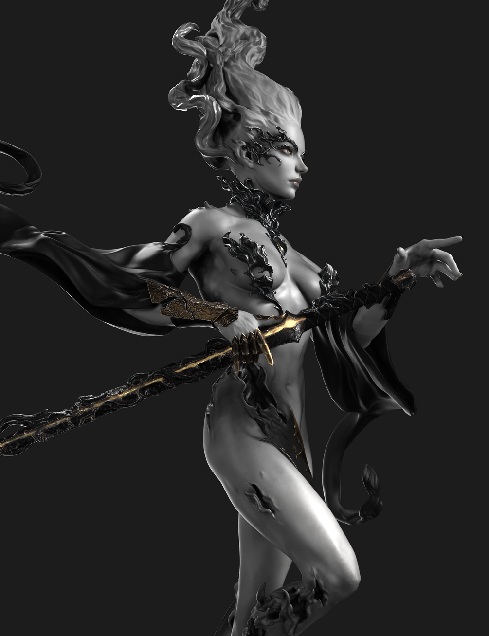 With this figure, I have tried to explore the element of fire and integrate it into the different parts of the sculpture's design. From the hair, which resembles a flame but with the texture of hair, to the skin with different hollows to represent something created from fire and alive, and the fabrics that move abstractly, combining the detail of wrinkles with the detail of flames.