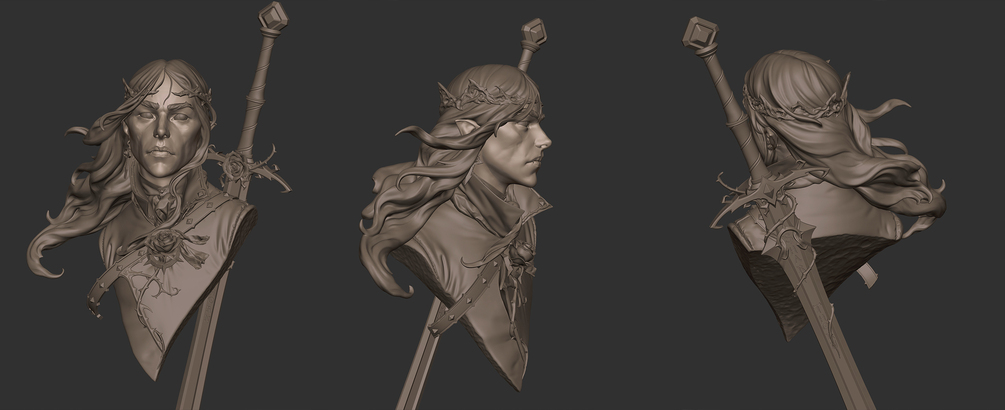 The .rar file consists of two possible versions, with and without a subtle baroque texture. In total there are 5 pieces for the bust, 6 counting the optional extra body. Head.stl, Body_clean.stl, body_textured.stl, Earring.stl, Belt.stl and Sword.stl